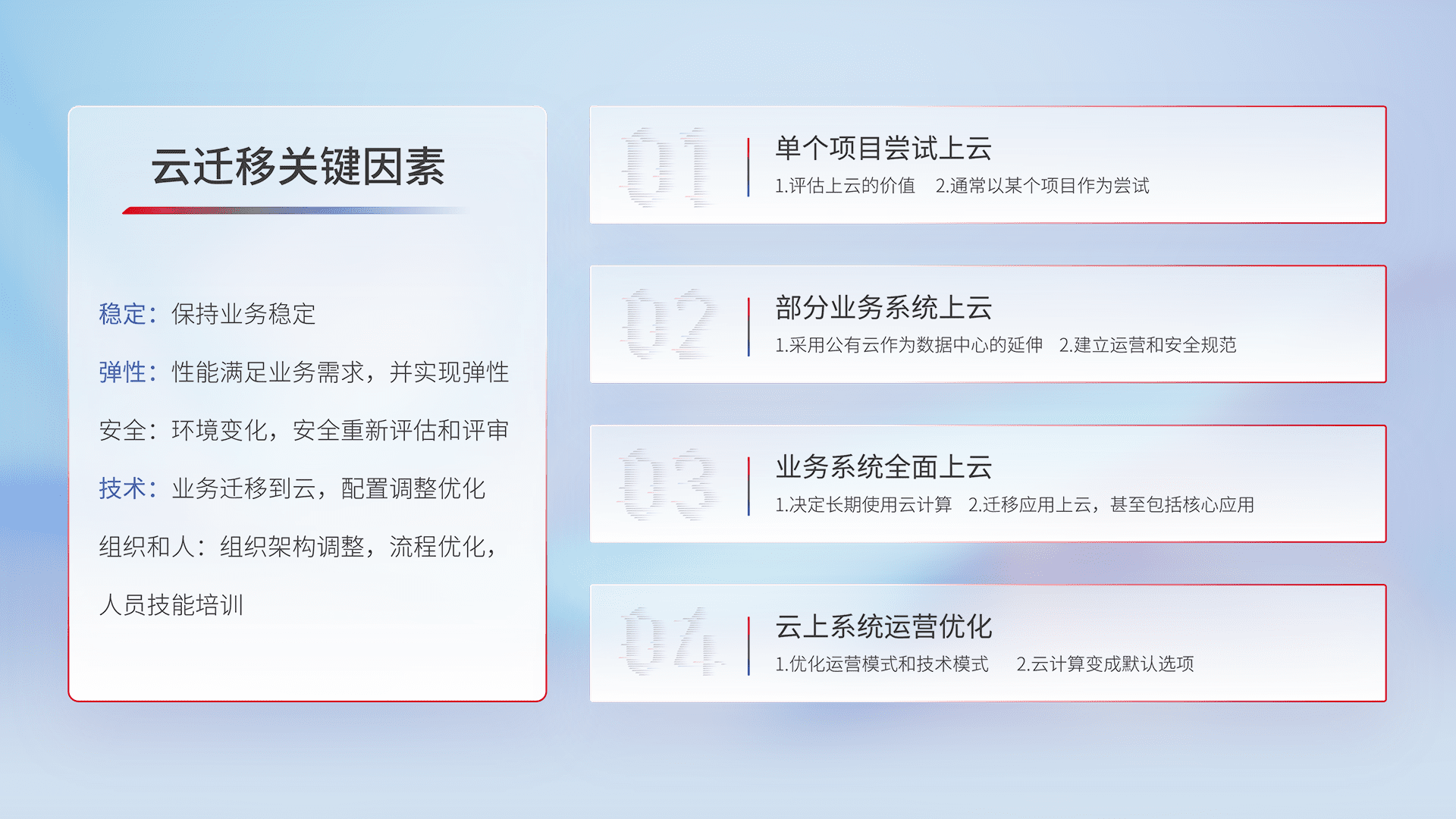 结合实际业务,,,,从规划设计、、云平台选型、、、、云原生改造、、、数据迁移、、、、集成交付,,,,迁移全过程为客户识别最佳上云路径,,,做好风险识别管理,,,,设计网络架构、、、身份权限、、安全审计合规、、、操作审计、、、日志审计、、、监控告警策略、、多站点容灾设计等,,对云上基础设施进行整体规划,,提升IT治理水平,,以满足弹性、、高可用、、高性能的需求。。。。