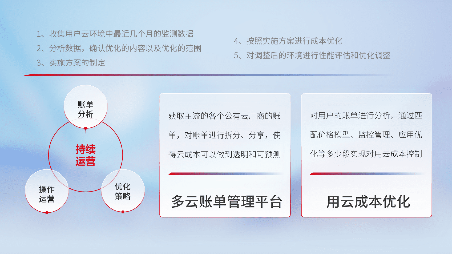 通过多云纳管,,以统一的资源数据模型把客户的云资源进行抽象和封装,,进而实现对多云资源的统一操作,,保障云资源管理的可靠性、、、、稳定性与可用性。。量身定制化运维内容,,配置、、开发运维、、、、补丁管理、、、备份、、监控、、、、认证和访问管理、、、审计和日常巡检等,,保障在用云过程中的可靠度,,,,稳定度以及高可用率。。。。